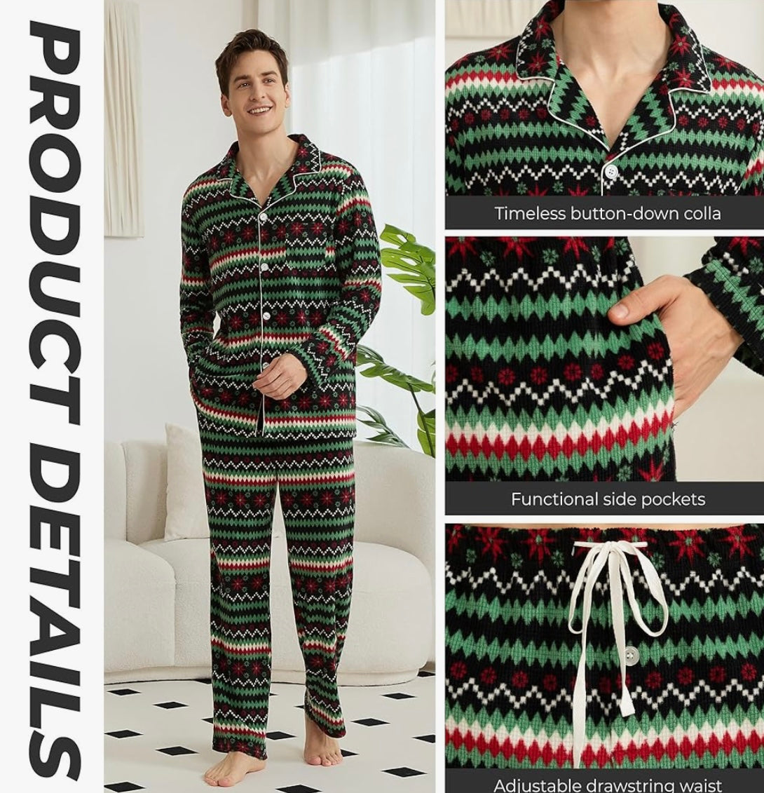 Men’s (Big Elf) Winter Fleece Pajama Set – Long Sleeve Sleepwear with Festive Nordic Pattern